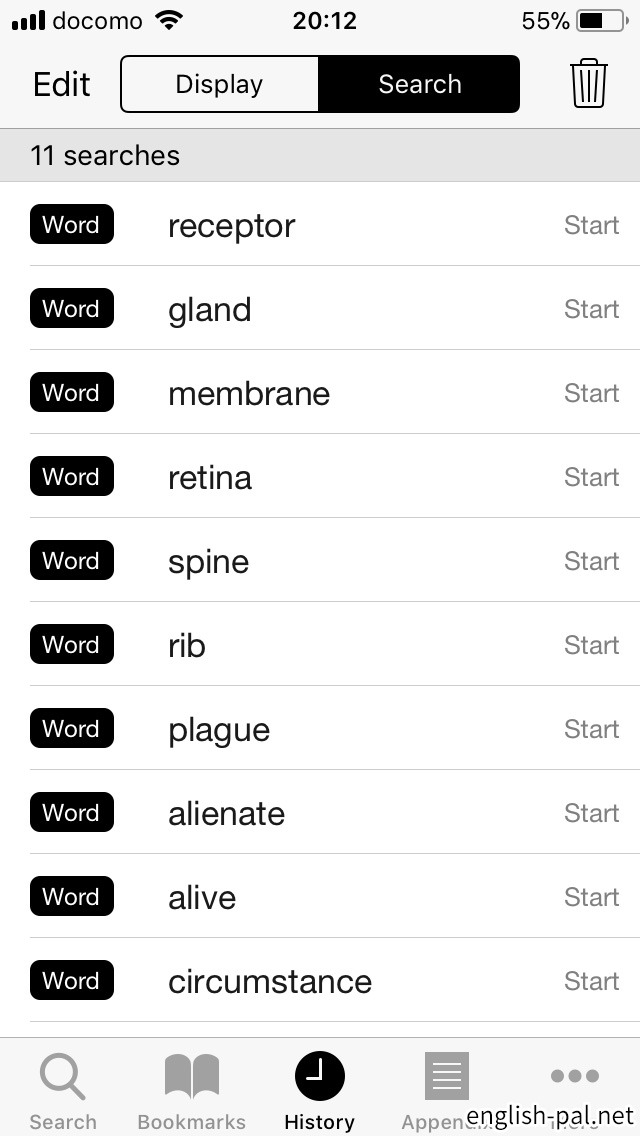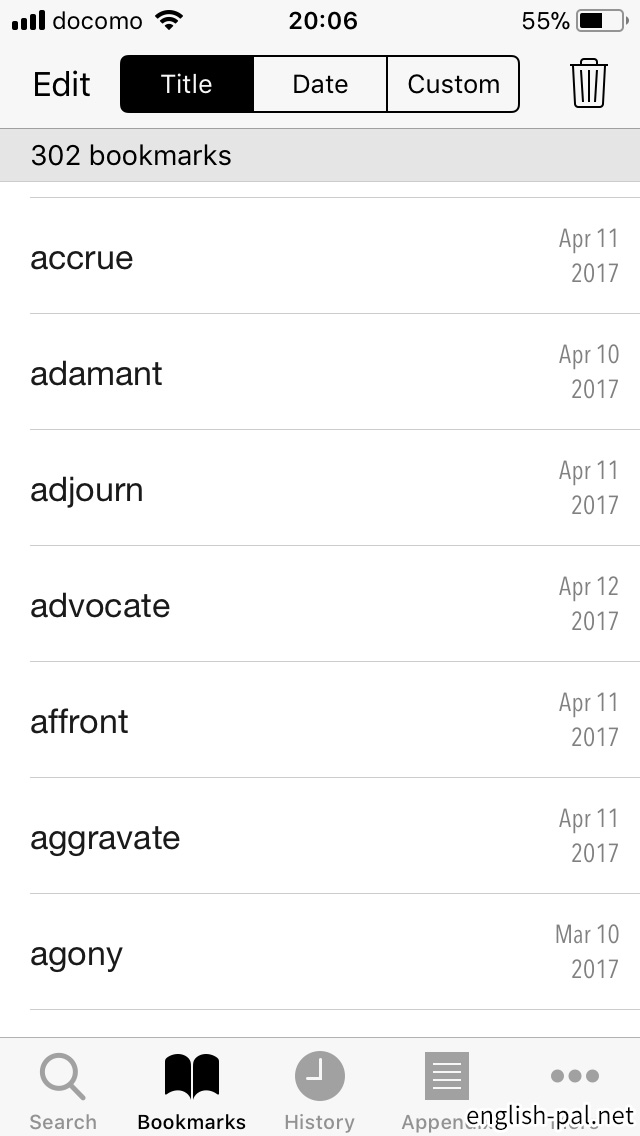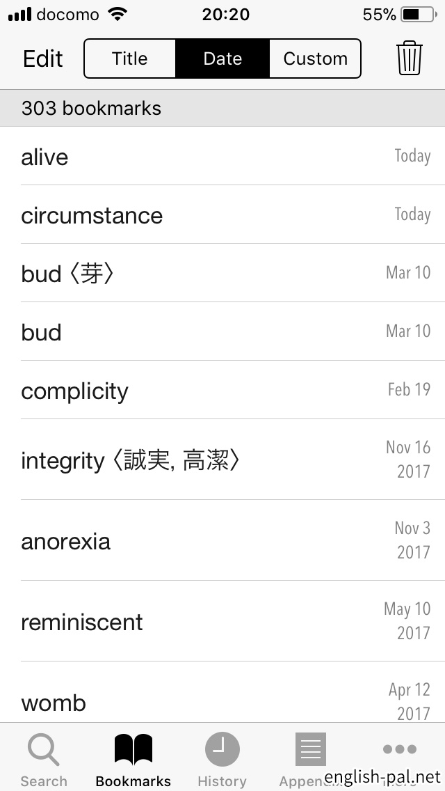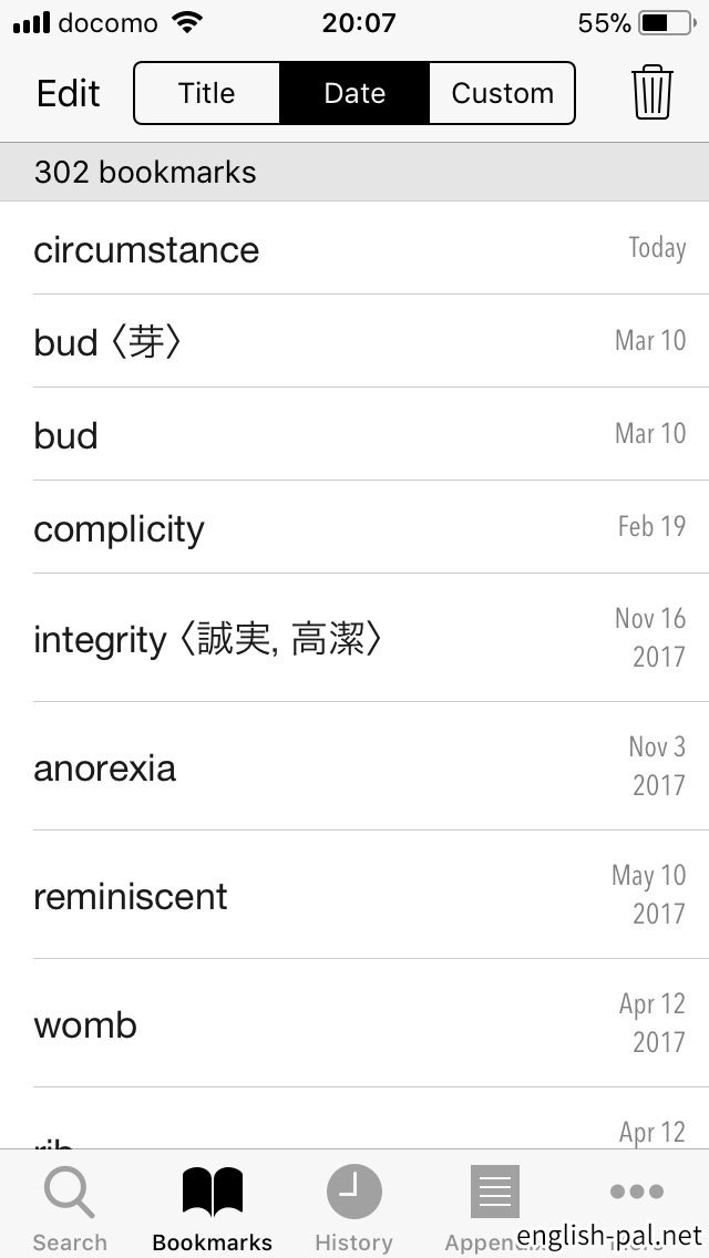 試しに、The Japan Timesの出る順で最短合格! 英検1級単熟語 EXから、一部を調べてみました。この単熟語集は2811項目が収録されています。