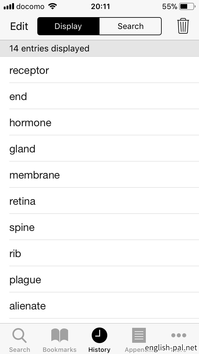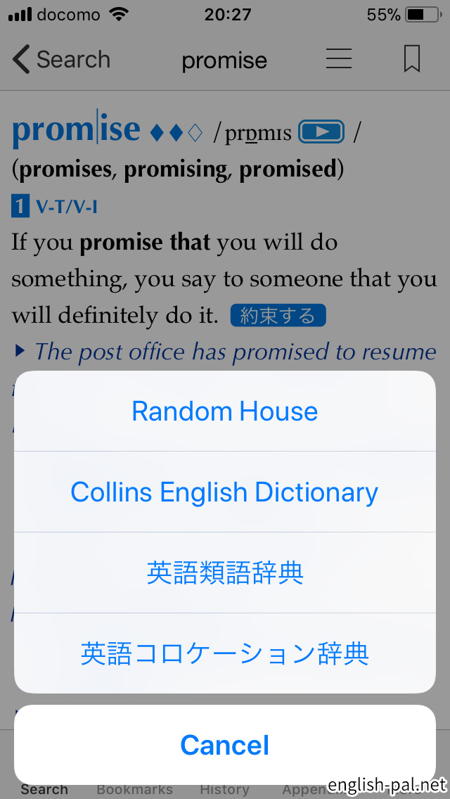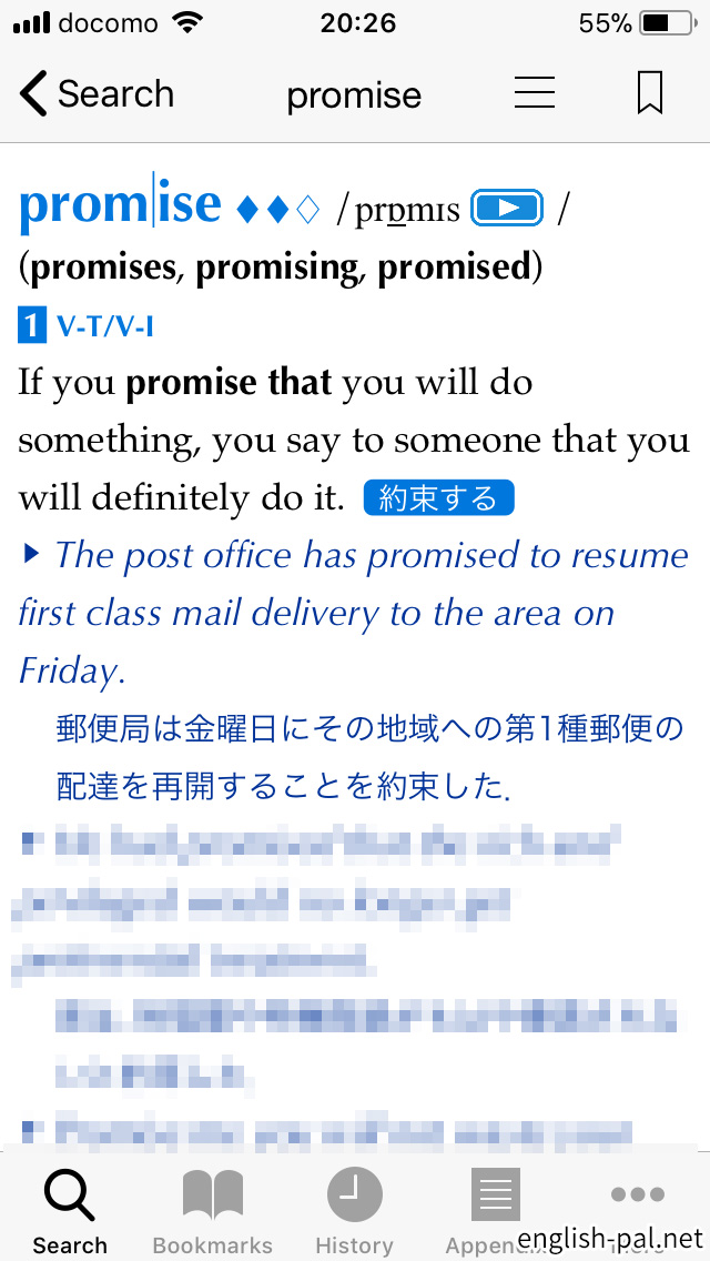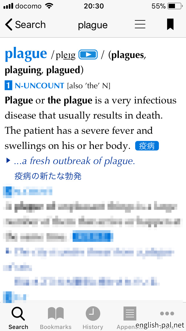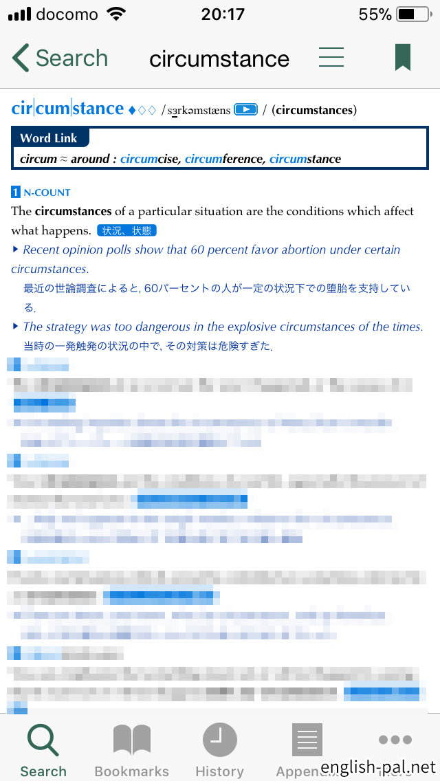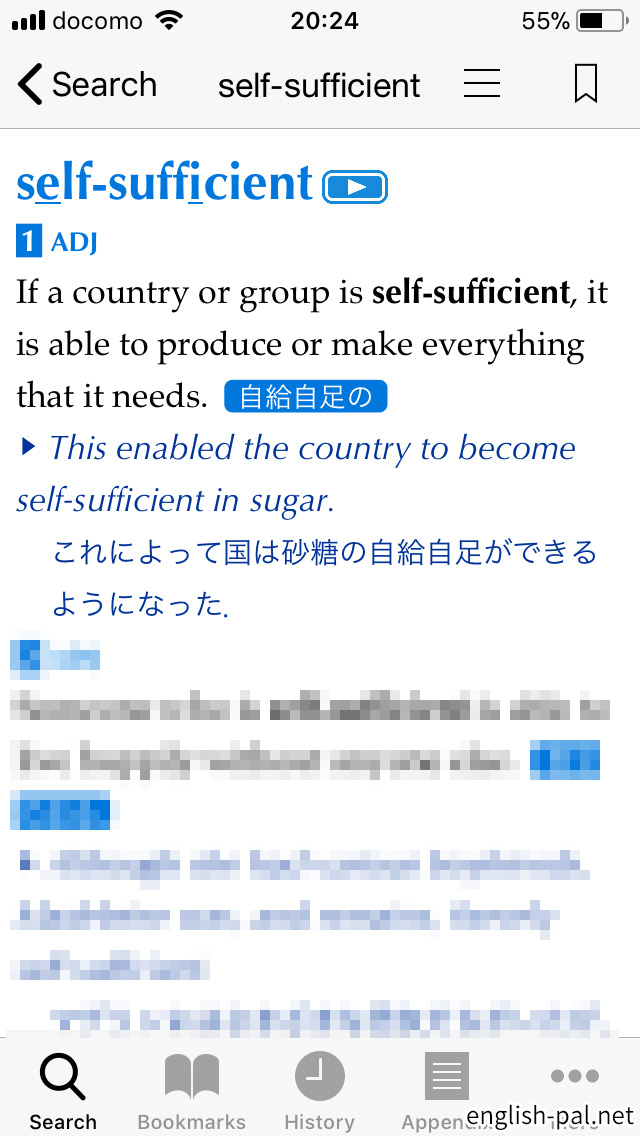 iPhone版では検索画面で調べたい語句を入力して、候補の中から希望の語句をタップして選ぶと、説明と例文が日本語訳と合わせて表示されます。