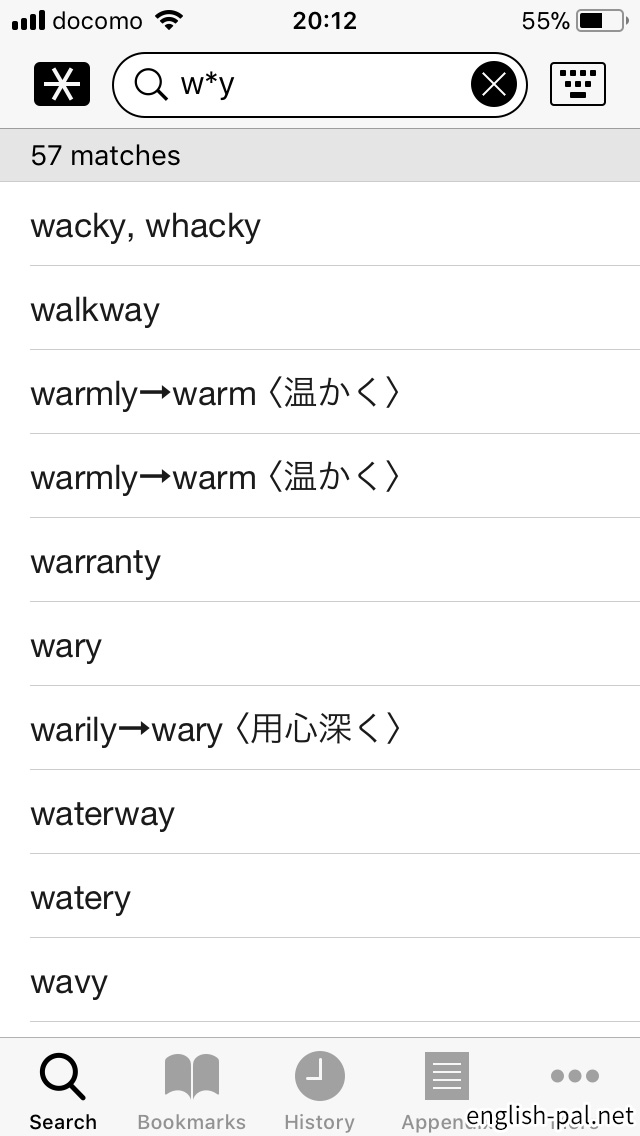 例えば「w*y」で検索すれば、wacky, whacky, walkway, warmly→warm〈温かく〉, warrantyなど57個の見出しが検索結果として表示されます。