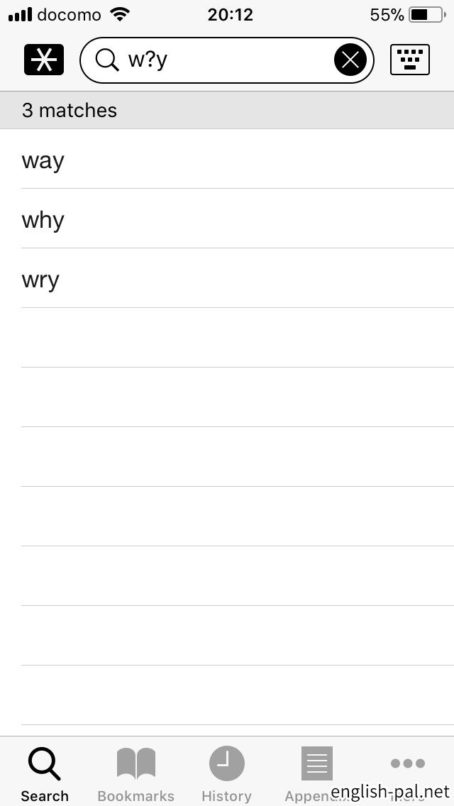 「w?y」ではway, why, wryの3つの見出しが検索結果として表示されます。