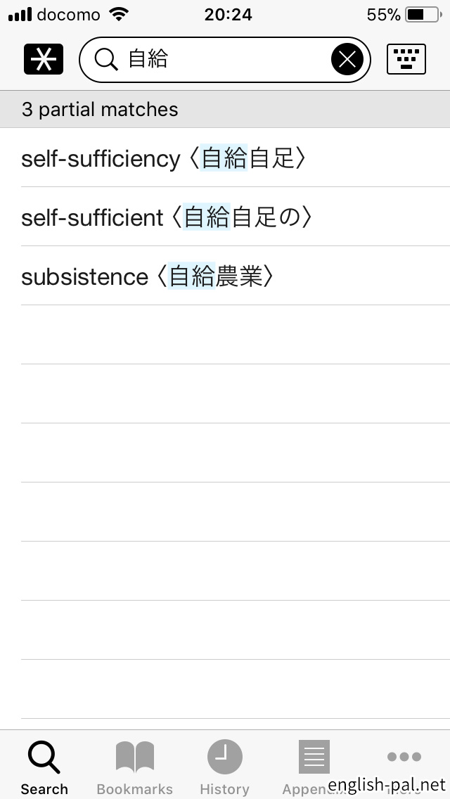 試しに「自給」を検索すると、self-sufficiency <自給自足>, self-sufficient <自給自足の>, subsistence <自給農業>が結果として表示されます。(コンテンツ保護のため一部画像をぼかしています)