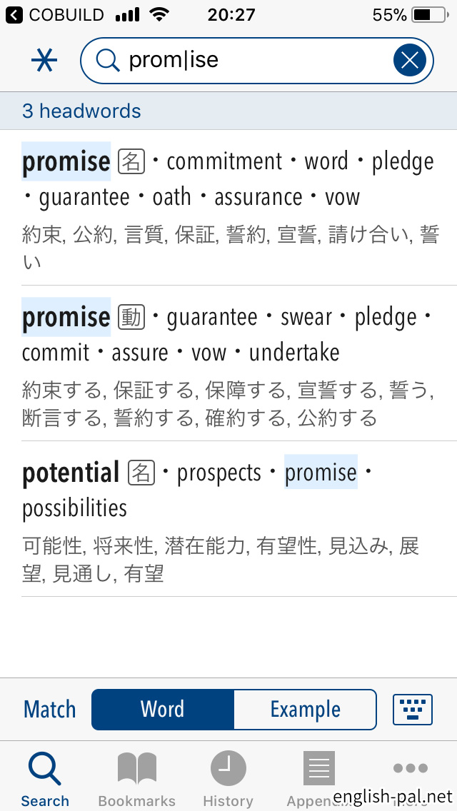 例えばコウビルド英英和辞典(米語版) - 物書堂で「promise」を検索、オックスフォード英語類語辞典で「promise」の類語を意味と単語、例文とその訳を見ることができます。(コンテンツ保護のため一部画像をぼかしています)