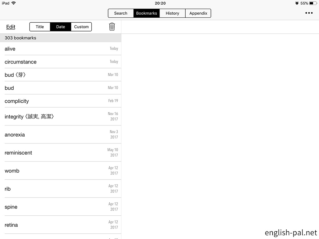 iPad版ではアプリを立ち上げると、左上に検索窓があるのが確認できます。下に候補が出てきますので、タップすると右側に語句の説明と例文が日本語訳と合わせて表示されます。