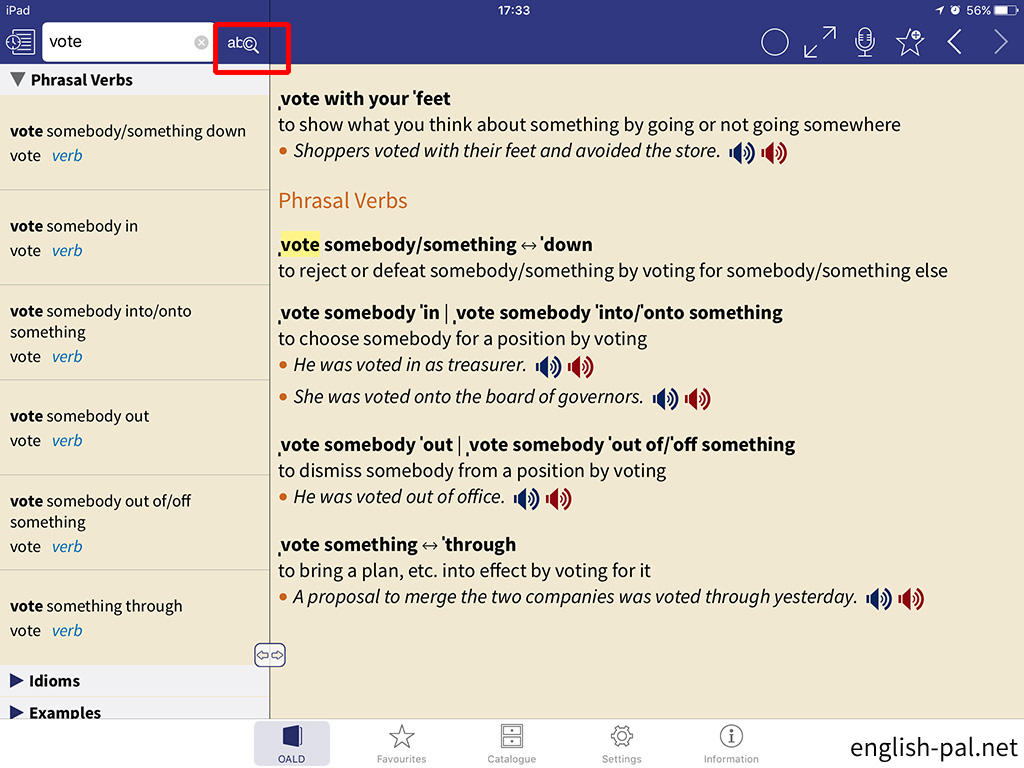 検索フィードの右側のアイコンをタップすると、句動詞、イディオム、例文を含めて検索することが出来ます。