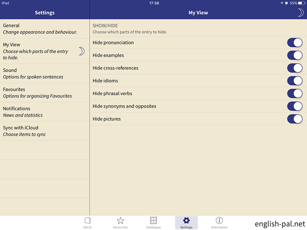 「Settings」から「My View」を選ぶことで、発音記号、例文、イディオム、句動詞、同義語と反意語、イラストなどをそれぞれ非常時にすることが出来ます。画面では発音記号を非表示にしました。